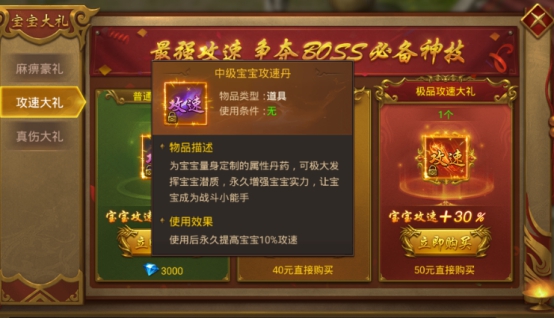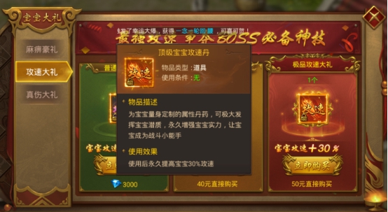 ③极品攻速大礼,50元可以直接购买,可获得顶级宝宝攻速丹,使用后永久提高宝宝30%攻速。