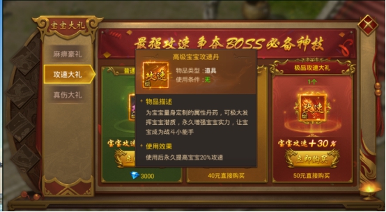 ②稀有攻速大礼,40元可以直接购买,可获得高级宝宝攻速丹,使用后永久提高宝宝20%攻速。