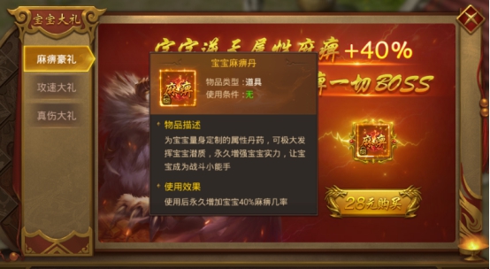 花费28元购买,可获得宝宝麻痹丹,使用后永久增加宝宝40%麻痹几率。