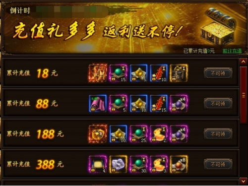 活动说明:活动期间内玩家只要充值相应的元宝,即可免费领取精美奖励!