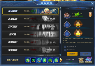 玩家达到一定等级并三星通关低级副本后才可以开启下一个副本,跨服副本概率掉落对应等级的坐骑装备、伙伴装备、神兵装备等。玩家创建房间后,即可与其他服务器的玩家进行组队(最多三人),届时副本将从三条不同路线刷出,组满三人更有概率获胜。