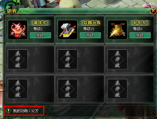 在游戏中玩家通过任务、副本或者活动都可以获得大量的三国功勋值,通过效果这些功勋值可以直接提升研究属性的等级,而且是立即完成呦,也就是说,只要是玩家有足够的功勋,便可以立即提升自己的研究属性,马上增强武将的战斗能力,如下图: