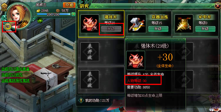 可以看到,玩家可以选择多种的研究方向,包括强体术、兵器冶炼、护甲术等,不同的研究会产生不同的效果,包括血量增加、攻击增加等。