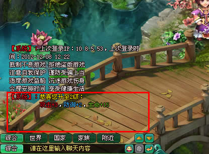 每次完成游戏中NPC所委托的任务后玩家都可以获得大量的经验和铜钱奖励,当玩家经验到达一定阶段时,便可以提升等级。每当玩家自身或者所携带的武将升级,在屏幕左下角聊天窗口处,就会有升级的提示,如下图: