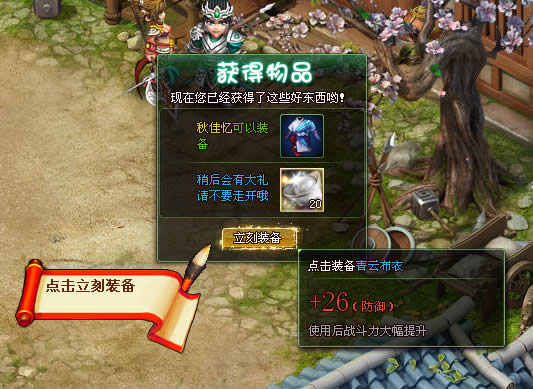 为了方便新手玩家操作,特意在获得可以提升属性的装备部件上加上了,快捷换装功能,只有玩家有新的可以提升属性的装备,系统会为玩家弹出对话框,玩家只需点击对话框中的立刻装备,该装备便会装备到玩家人物上。