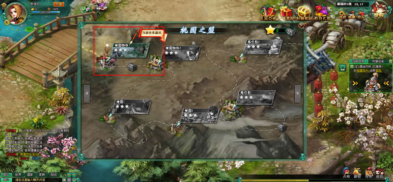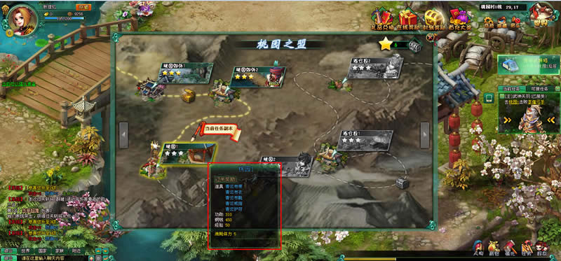 在就出貂蝉美眉后,玩家跟随剧情又踏上了自己的三国之旅,来到了桃源村副本,在副本沙盘地图上,玩家只需要将鼠标移动到地图图标上,便可以查看该副本地图可以获得的奖励内容,当玩家缺少某些装备、锻造材料或者锻造图纸时,可以体力这个方法快速收集。