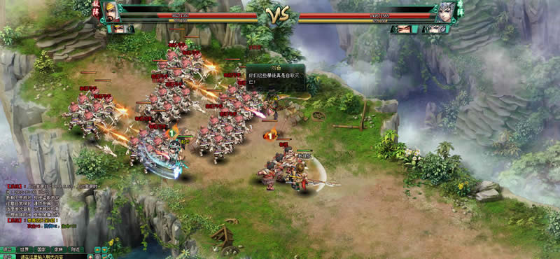 当玩家的人物进入到怪物的视野范围内,将触发战斗画面。在《战·三国》的战斗中,采取的是全自动的战斗模式,玩家不需要进行任何操作,即可查看全部的战斗情况,战斗分三路行军,每一列的玩家对抗对应一列的怪物,当一列的怪物被清光,玩家或携带的武将会自动进行换行操作,换行后,玩家势力将会增加一定的怒气,随着战斗的持续,双方的怒气值会一直增加,当怒气暂满全部怒气槽时,玩家的武将会按照布阵站位释放独特的武将技能