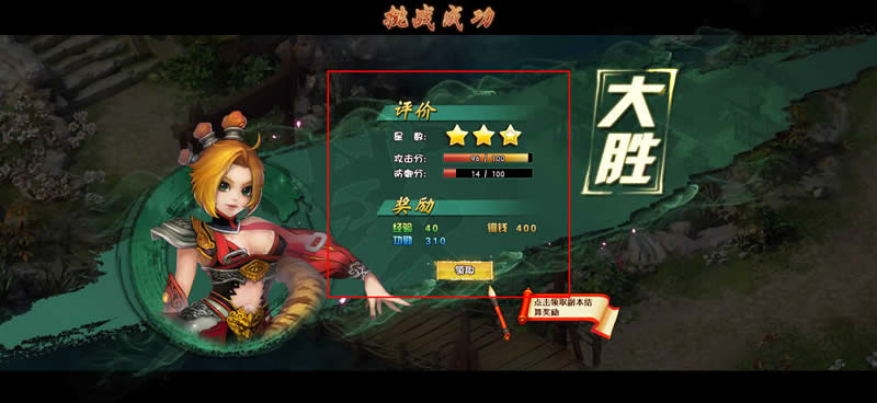 部分副本地图拥有多个怪物,每当玩家通关一个副本地图,就会获得一次结算奖励,会对当前副本地图战斗进行评分,包括总星级、攻击分、防御分,已经所获得经验、铜钱、功勋奖励等,在部分副本还可以获得锻造图纸、锻造材料或装备的副本奖励。