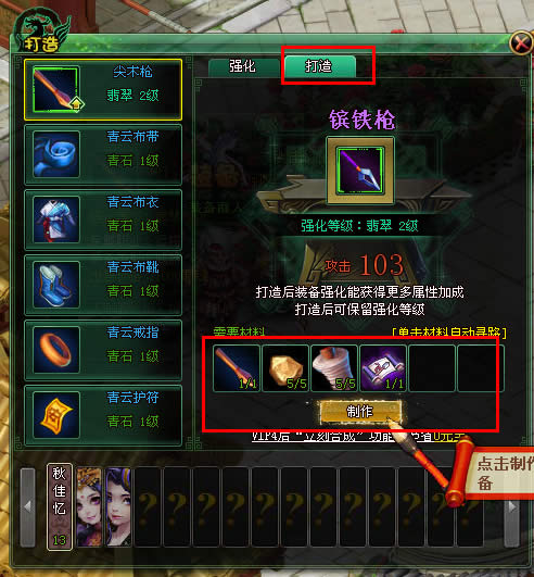 打造装备需要有对应装备部位的锻造图纸,已经锻造材料,锻造图纸可以通过英雄副本以及任务获得,当玩家有可以打造的装备时,系统会在游戏界面下方的人物功能图标上有个向上的箭头标志,提示玩家可以进行某件装备的打造。