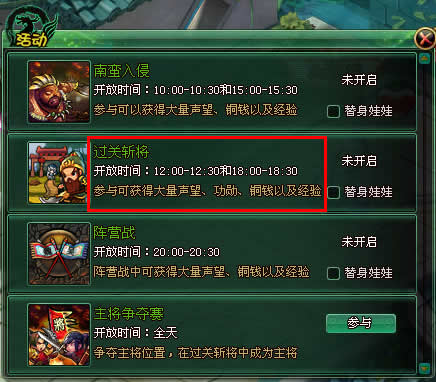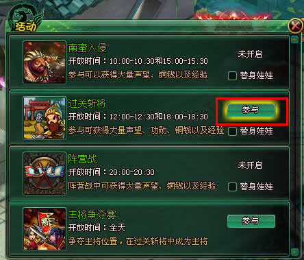 在了解了“过关斩将”的相关内容之后,玩家需要点击活动右侧的“参加”按钮,进入活动页面,如下图: