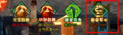 功勋鼓舞:消耗1000功勋有几率提升10%战斗力以及10的士气恢复速度,最多使用5次