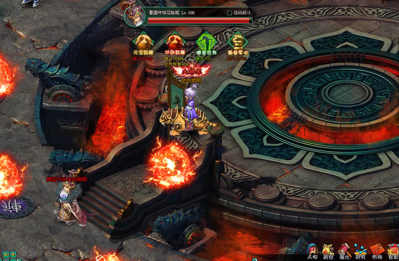 点击日常活动列表中过关斩将右侧“参与”按键后,玩家进入过关斩将活动界面,在活动地图中心会出现参加活动的所有玩家,中心外围将会是主将争夺赛中成功占领守将位置的玩家,每个国家总计4名玩家,总计12名玩家将作为过关斩将活动中的BOSS出战,为自己阵营抵挡其他阵营势力的进攻,进攻的玩家,只需要通过跟随黄色箭头指引点击其他玩家形象进行进攻即可,如下图: