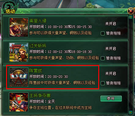 阵营战活动内容:参加活动可以获得大量声望、铜钱以及经验奖励。