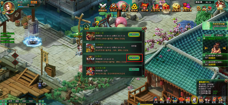 首先玩家需要点击游戏界面上方功能列表条中的日常活动功能按键,如下图: