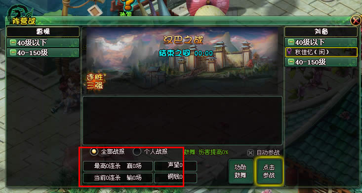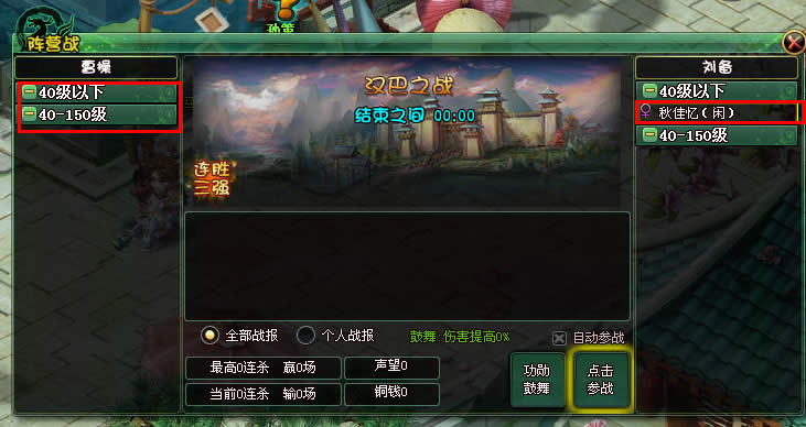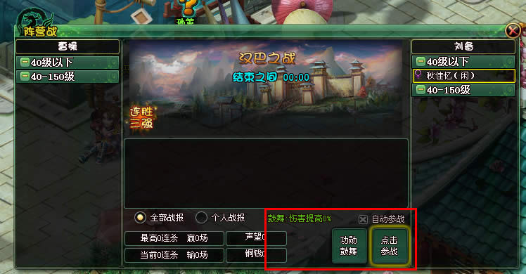 玩家可以点击活动界面下方的“点击参战”功能,点击后玩家便会进入阵营真排队列表,战斗信息会显示在上方信息栏中,同“南蛮入侵”活动一样,玩家可以通过利用功勋鼓舞,增强玩家的战斗力,使造成的伤害有明显的提高。