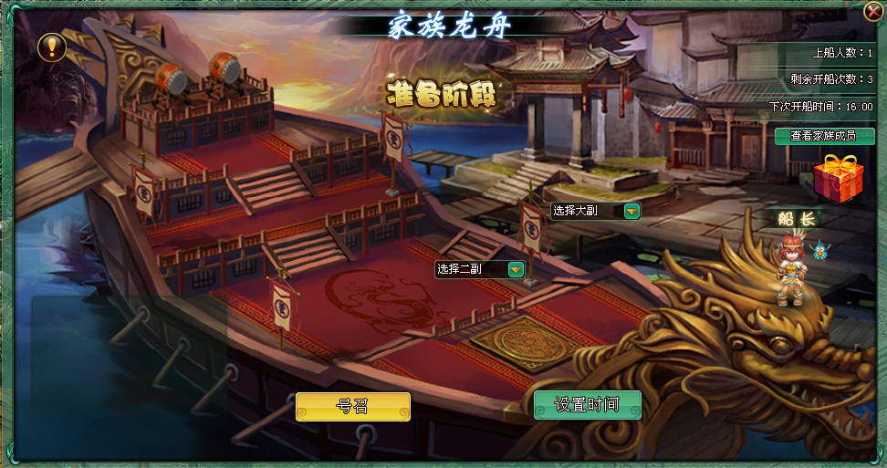 家族长点击龙舟活动界面的【上船】后,可进行家族活动号召。